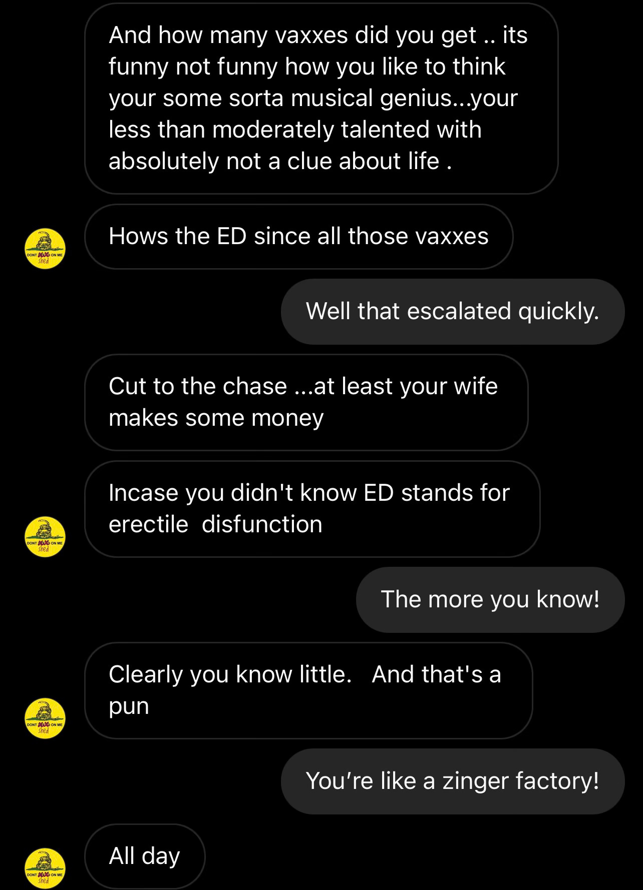 I shared the phone recording that night with a few friends that were aware of the situation, and for a very brief moment I felt a little calmer. It was many moons and subsequent trollings later when I received a most interesting dm from someone claiming to know The Troll’s identity. After a little research of my own to confirm, it turned out the offender is indeed a local woman; a known sycophant of the soulless far-right looney bin. I felt relieved, yes—there was no apparent threat, and this was not the messenger of some larger cabal of haters, at least here in town—but I felt a surprising measure of sadness too, knowing that this is the way scores of people are spending their lives now. Trolling. What a fucking waste. I tried to feel some pity, but admittedly that proved extraordinarily difficult. I wrote to her and asked in a firm, unpleasant tone to stop contacting us. So far that’s seemed to work, at least for us. Apparently she’s still at it, and has merely pointed her vitriolic hose elsewhere.