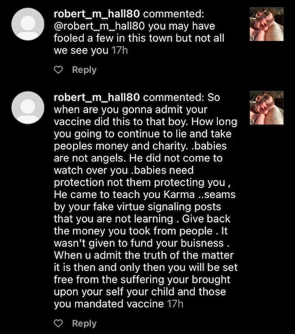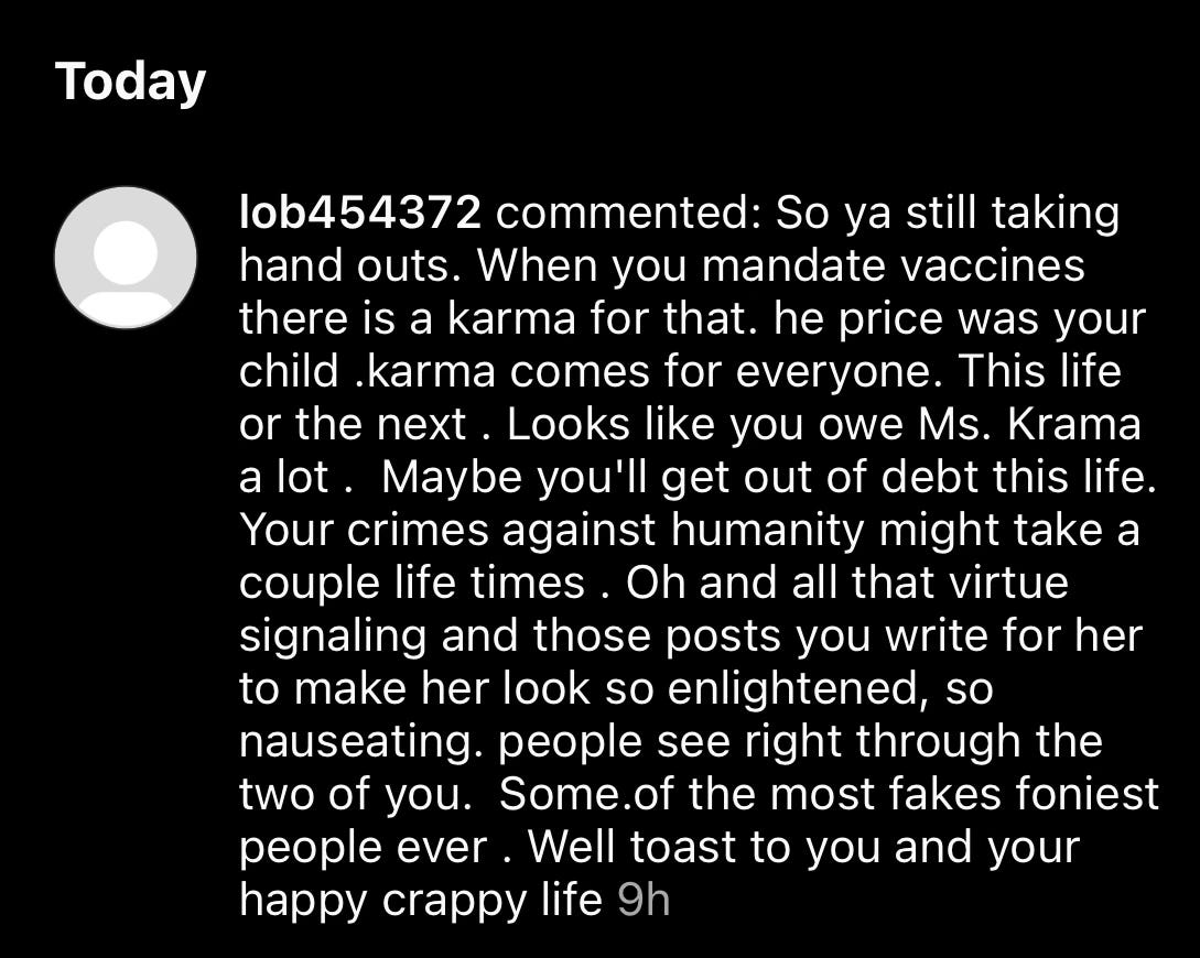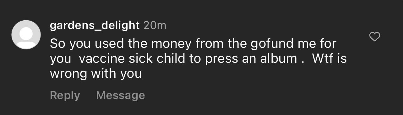 I remember thinking “so fucking goddamn rude” as I reported and blocked the new account. I didn’t care about the bogus money claim, but the vaccine thing irked me. How dare you claim to know what was wrong with my child and then in the same breath ask what’s wrong with ME? I felt disgusted, and so annoyed she was back. I didn’t yet have proof The Troll was a woman, but the first account used the name lindajennings1972. We just always called The Troll Linda.