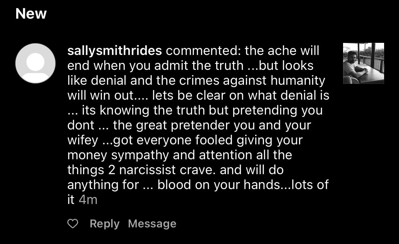 You’ll notice that each new transmission is a different account name, while the poor grammar, spelling, and syntax are all undeniably similar. I’d block and report each new account, but before too long another one would grow, wart-like in its place. The pattern became familiar and annoying, and began to feel obsessive and worrisome. This was 2020, and an alarming number of people seemed to be slipping towards madness. I made the decision to stop responding, hoping to starve the troll of oxygen.